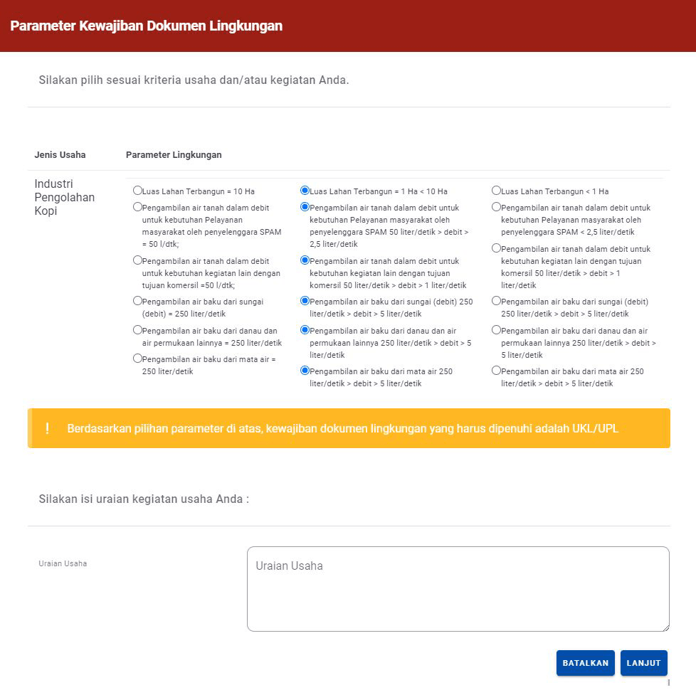 - Bila pelaku usaha sudah memiliki dokumen persetujuan lingkungan, maka pelaku usaha memilih jenis dokumen persetujuan lingkungan yang dimilikinya