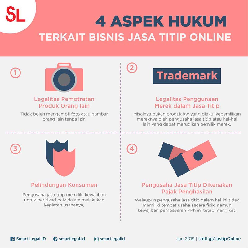 Untuk info lebih lengkap silahkan baca artikel mengenai Empat Aspek Hukum Terkait Bisnis Jasa Titip Online