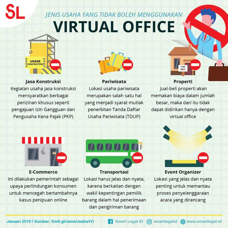 Usaha di bidang jasa konstruksi tidak dapat didirikan dengan virtual office karena dibatasi oleh beberapa persyaratan tertentu. Kegiatan usaha jasa konstruksi mensyaratkan berbagai perizinan khusus seperti pengajuan Izin Gangguan dan Pengusaha Kena Pajak (PKP).