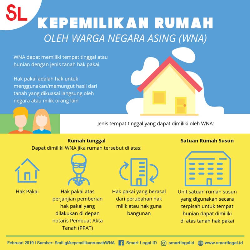 Sistem hukum agraria di Indonesia menganut asas nasionalisme. Asas nasionalisme didasarkan pada Pasal 21 ayat (1) jo. Pasal 26 ayat (2) Undang-Undang Pokok Agraria (UUPA) dimana hanya warga negara Indonesia (WNI) yang boleh memiliki hak milik atas tanah. Lantas, bagaimana kepemilikan rumah yang juga meliputi pelekatan tanah atas rumah oleh warga negara asing (WNA)? Artikel ini akan membahas lebih lanjut mengenai kepemilikan hunian oleh WNA.