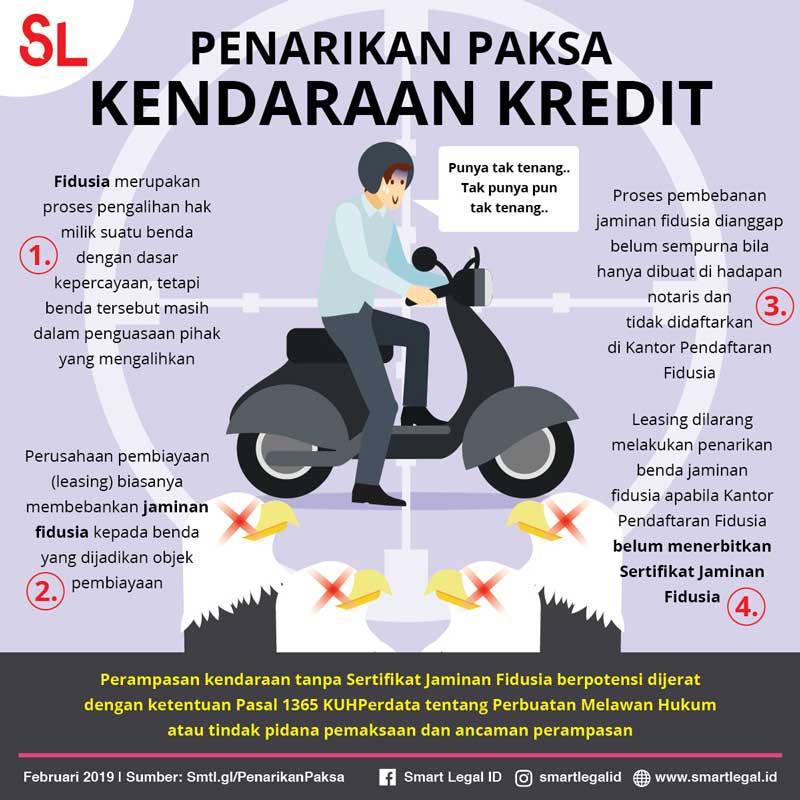 Atas fasilitas pembiayaan tersebut, Amir dan Perusahaan B sebenarnya telah membuat Perjanjian Pembiayaan Bersama Dengan Penyerahan Hak Milik Secara Fidusia atas Motor di hadapan Notaris. Namun, penarikan motor oleh debt collector dilakukan tanpa menunjukkan Sertifikat Jaminan Fidusia. Amir pun tak berdaya dan akhirnya merelakan motornya ditarik paksa darinya.